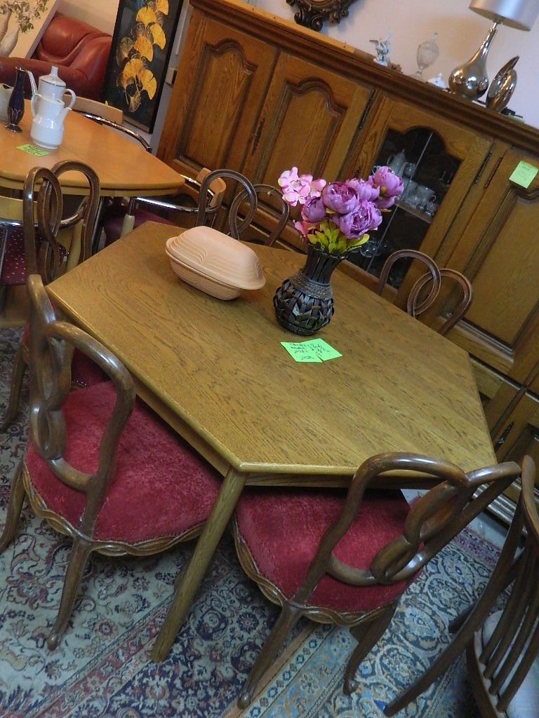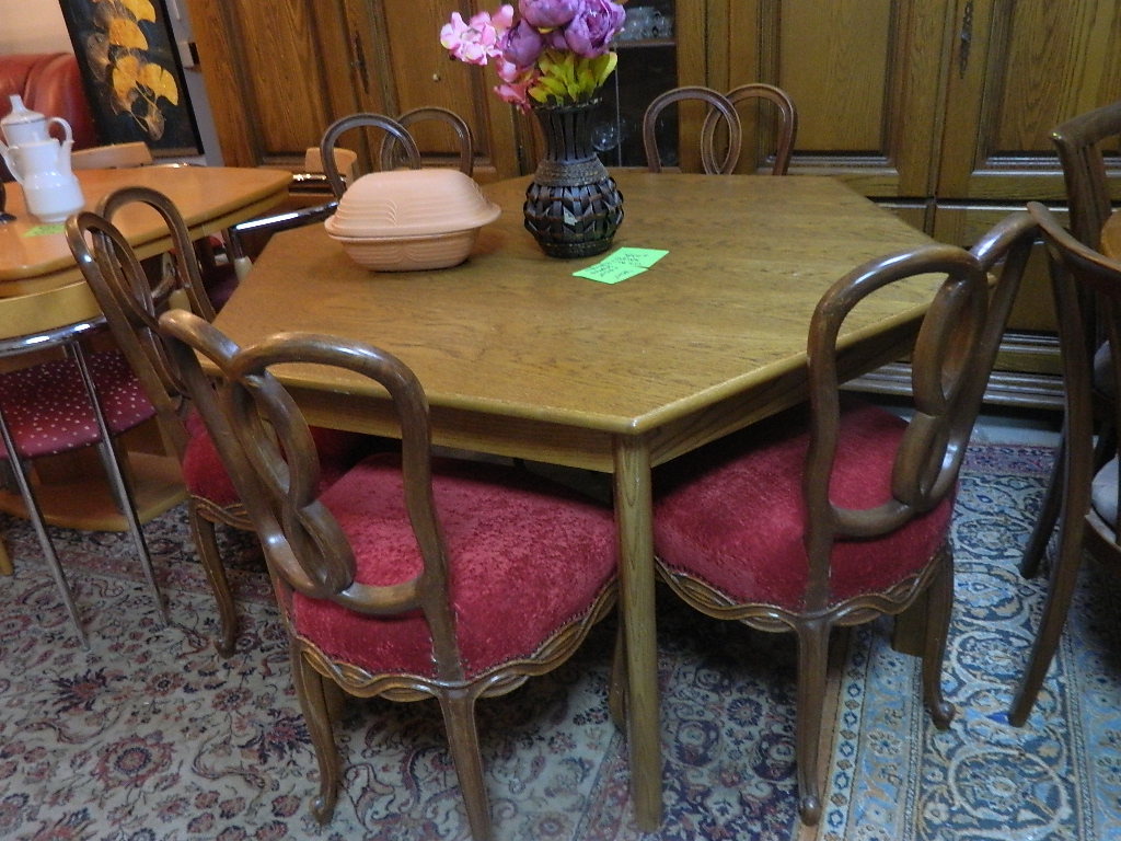 masa lemn hexagon extensibila si scaune lemn cu textil]]]