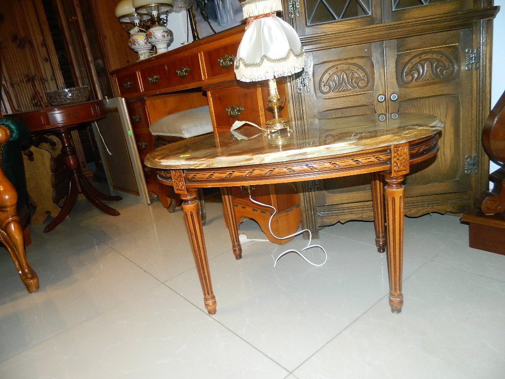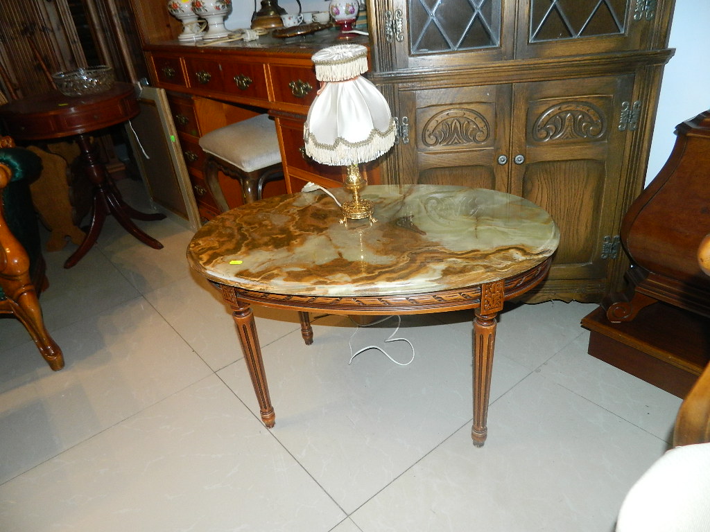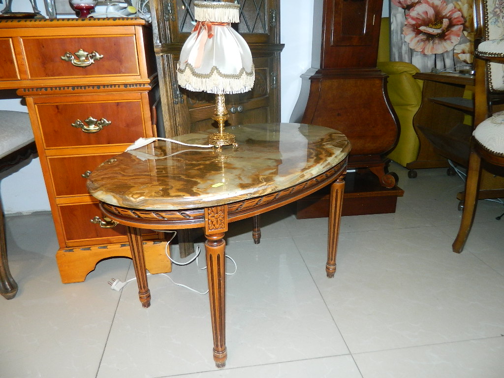 masa ovala marmura bej cu maron pe cadru de sustinere din lemn,.,.